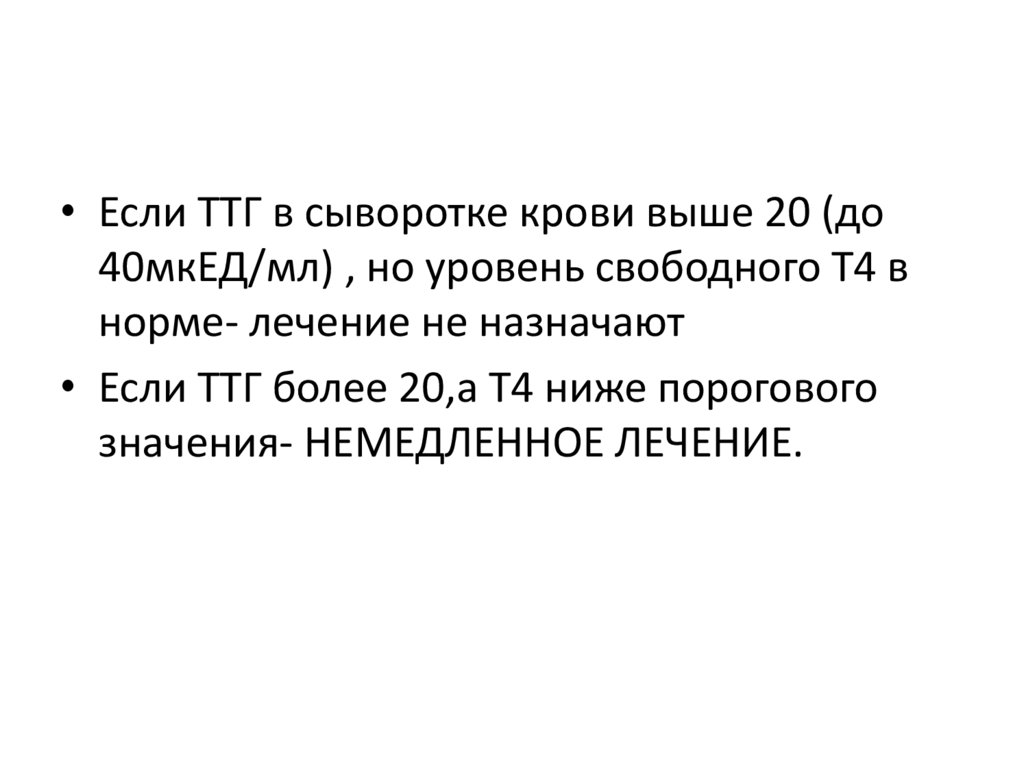 • Если ТТГ более 20,а Т4 ниже порогового