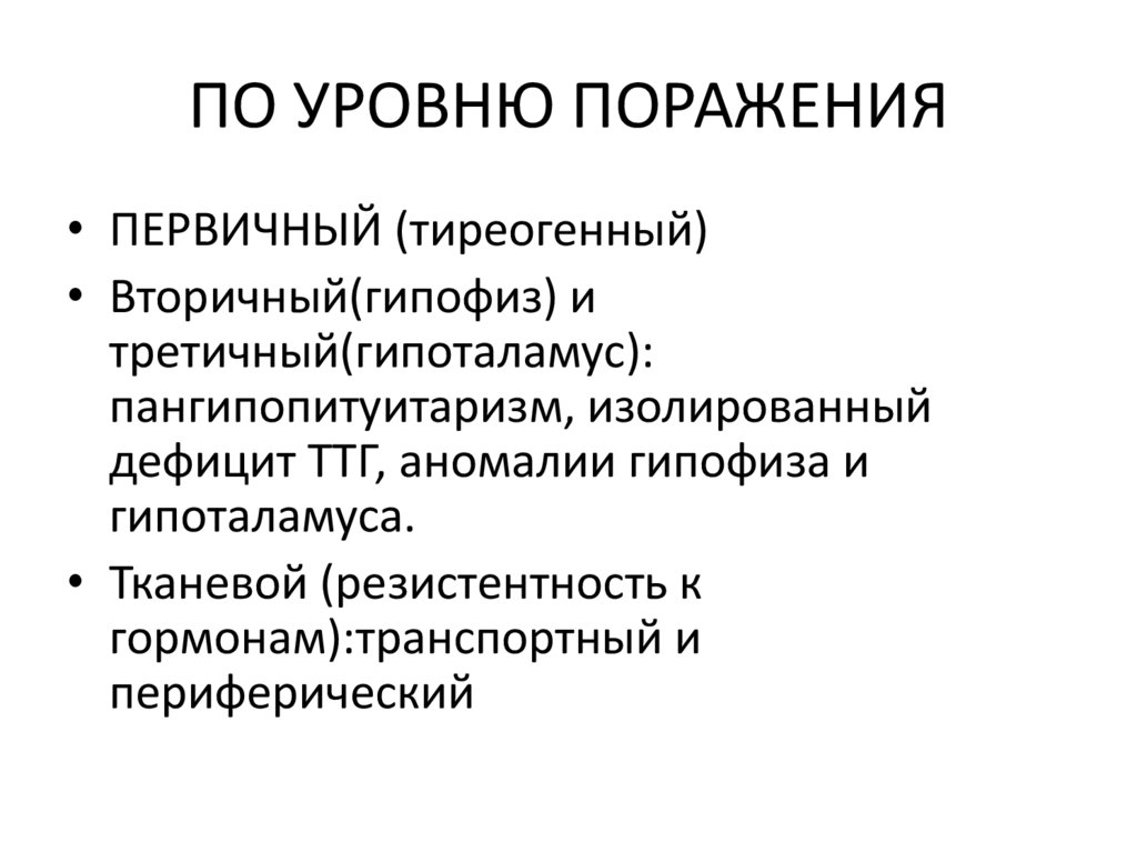 ПО УРОВНЮ ПОРАЖЕНИЯ• ПЕРВИЧНЫЙ (тиреогенный)
