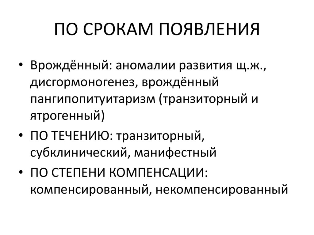 ПО СРОКАМ ПОЯВЛЕНИЯ• Врождённый: аномалии развития щ.ж.,