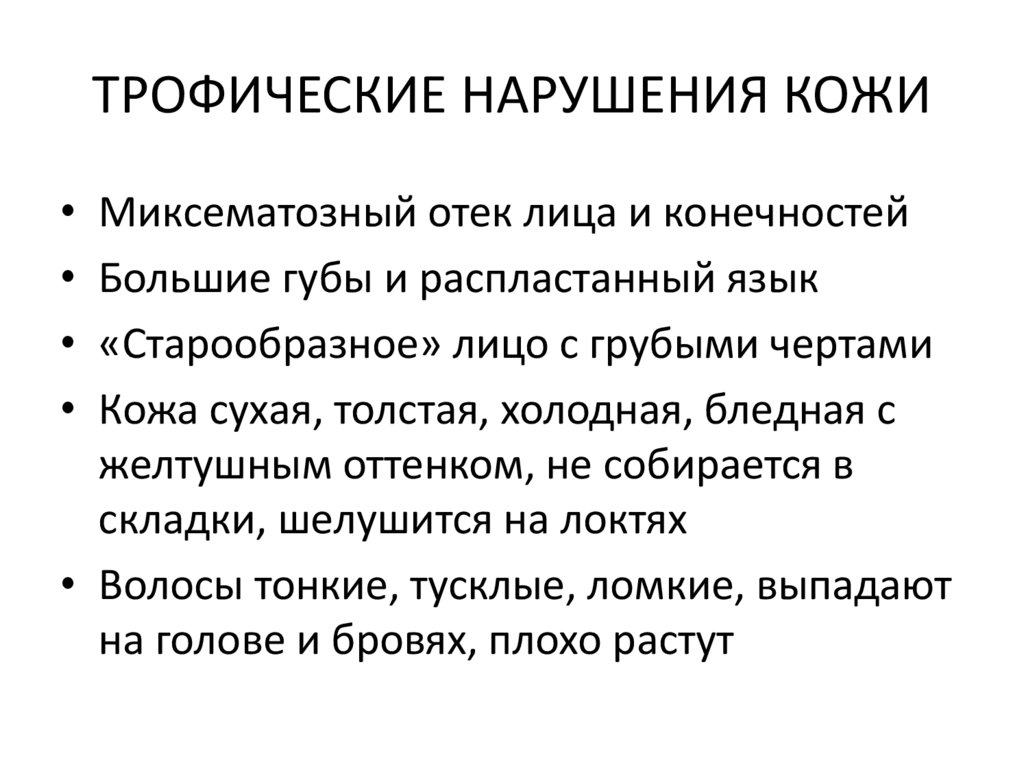 ТРОФИЧЕСКИЕ НАРУШЕНИЯ КОЖИМиксематозный отек лица и конечностей