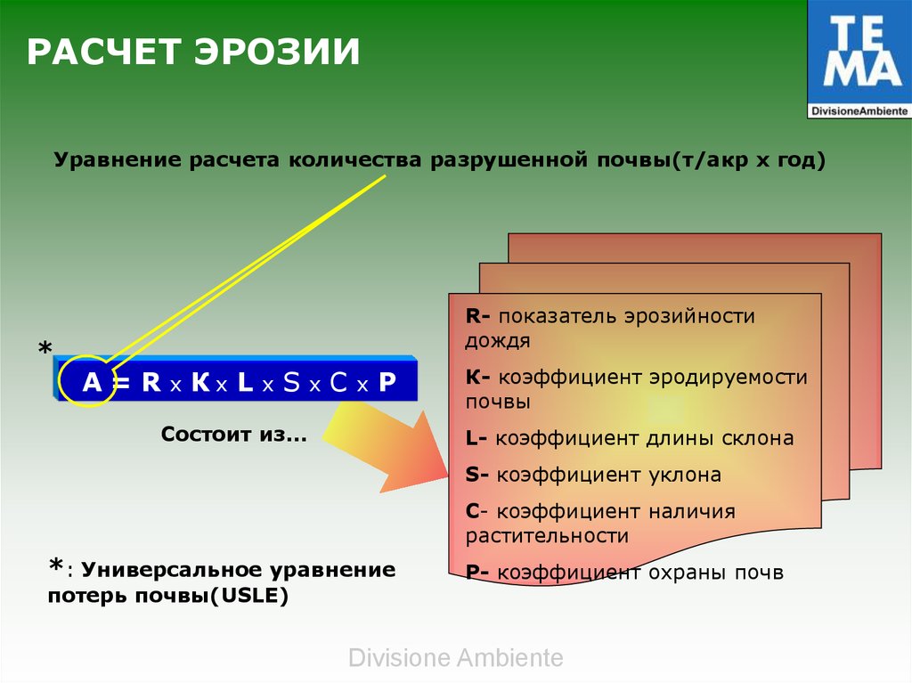 РАСЧЕТ ЭРОЗИИУравнение расчета количества разрушенной почвы(т/акр х год)