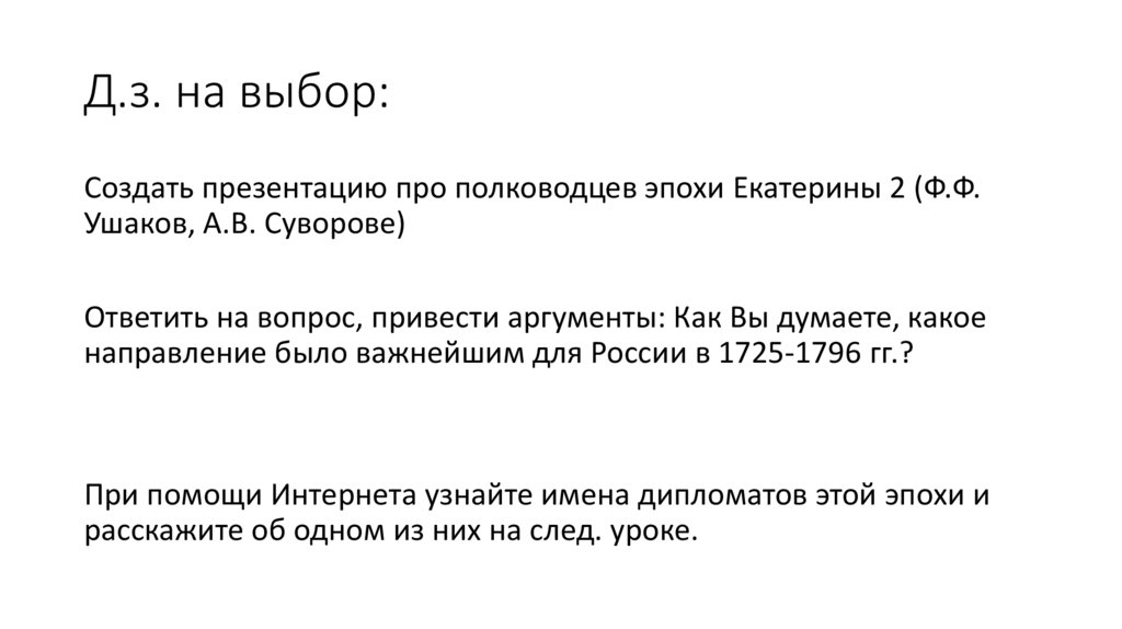 Д.з. на выбор:Создать презентацию про полководцев эпохи Екатерины 2 (Ф.Ф.