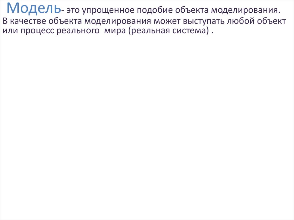 Модель- это упрощенное подобие объекта моделирования.В качестве объекта моделирования может выступать любой объект