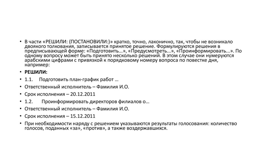 • В части «РЕШИЛИ: (ПОСТАНОВИЛИ:)» кратко, точно, лаконично, так, чтобы не возникалодвоякого толкования, записывается принятое решение. Формулируются решения в