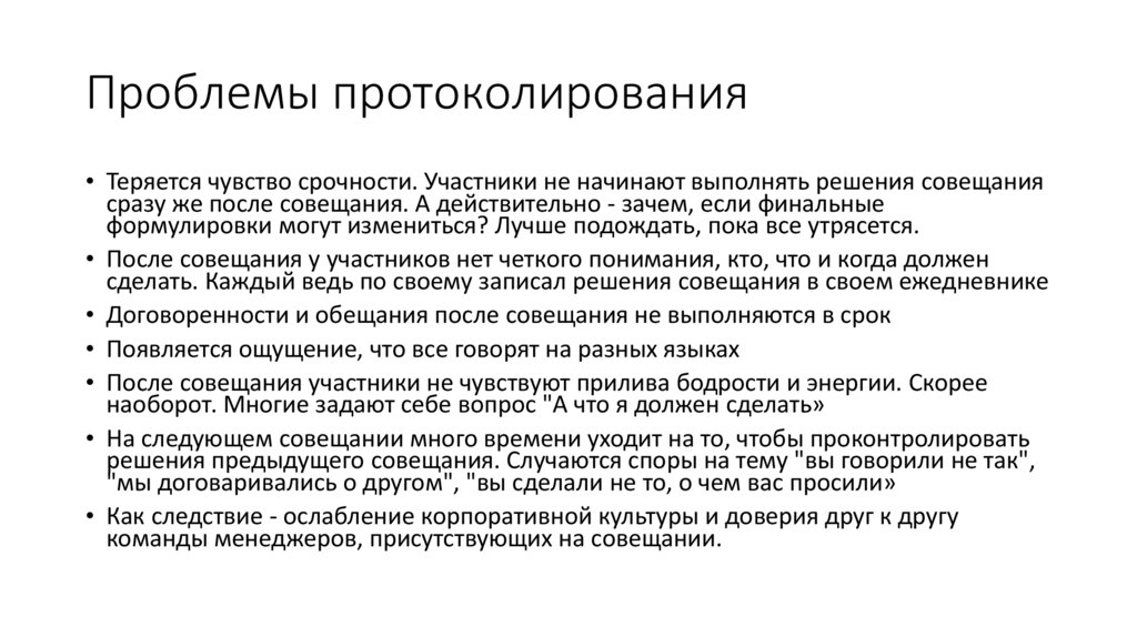 Проблемы протоколирования• Теряется чувство срочности. Участники не начинают выполнять решения совещания