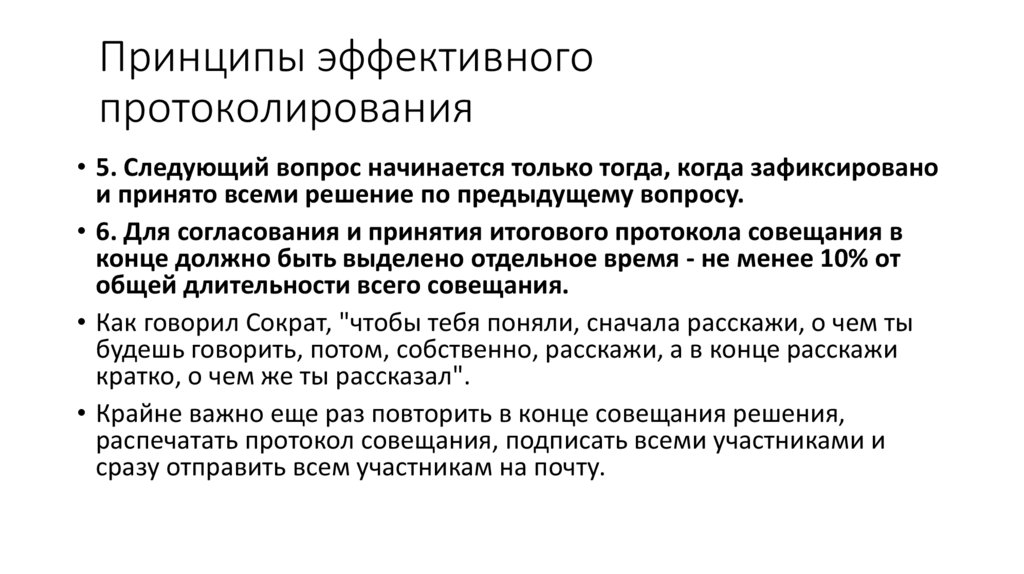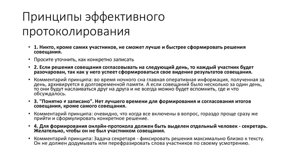 • Комментарий принципа: Задача секретаря - фиксировать решения максимально близко к тексту.