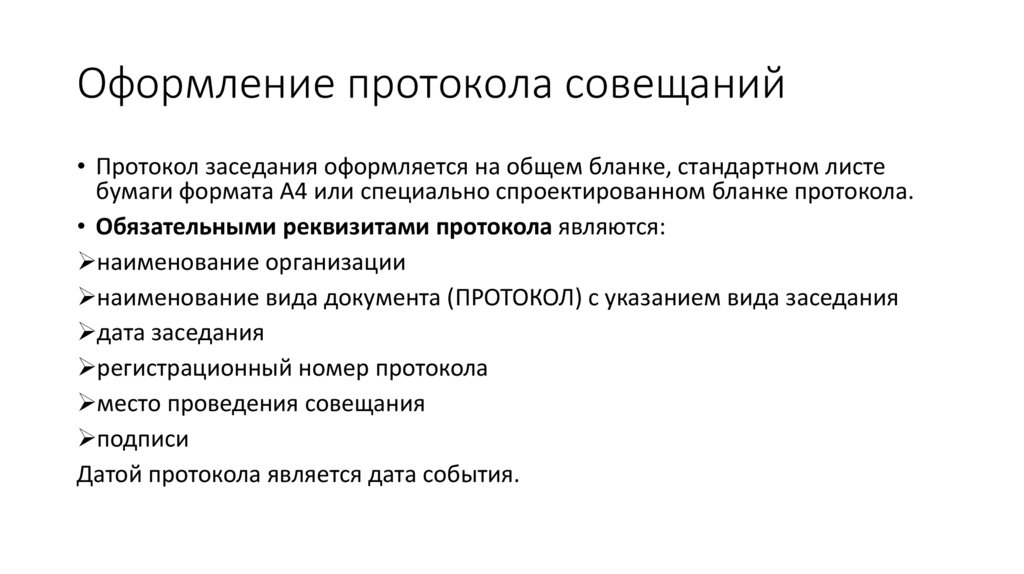Оформление протокола совещаний• Протокол заседания оформляется на общем бланке, стандартном листе