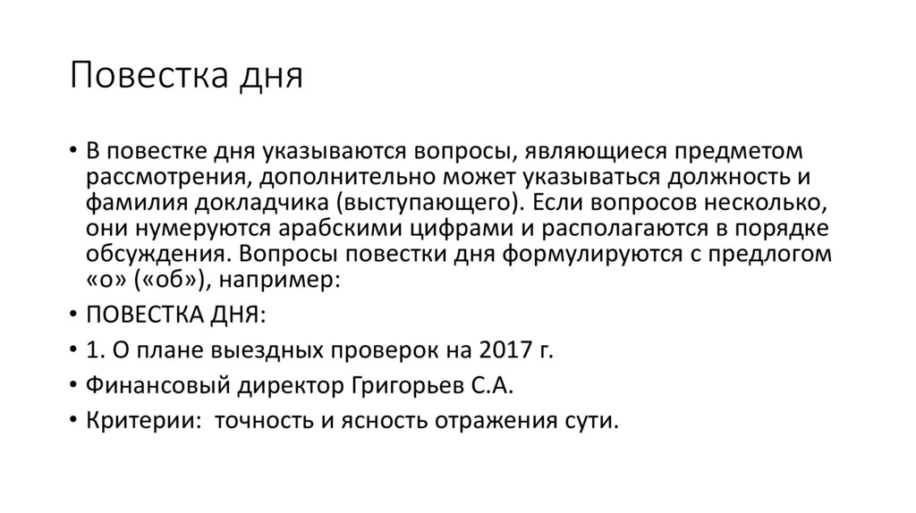 обсуждения. Вопросы повестки дня формулируются с предлогом
