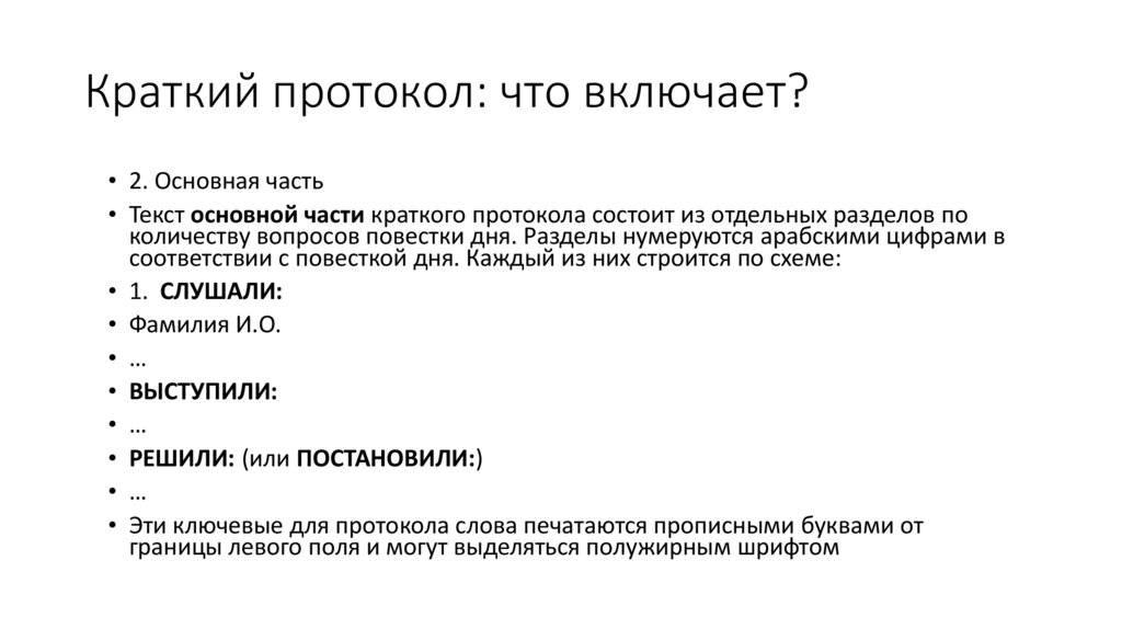 • Текст основной части краткого протокола состоит из отдельных разделов по