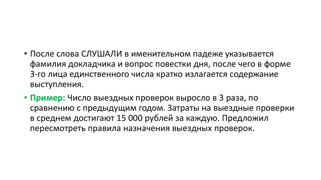 • После слова СЛУШАЛИ в именительном падеже указываетсяфамилия докладчика и вопрос повестки дня, после чего в форме