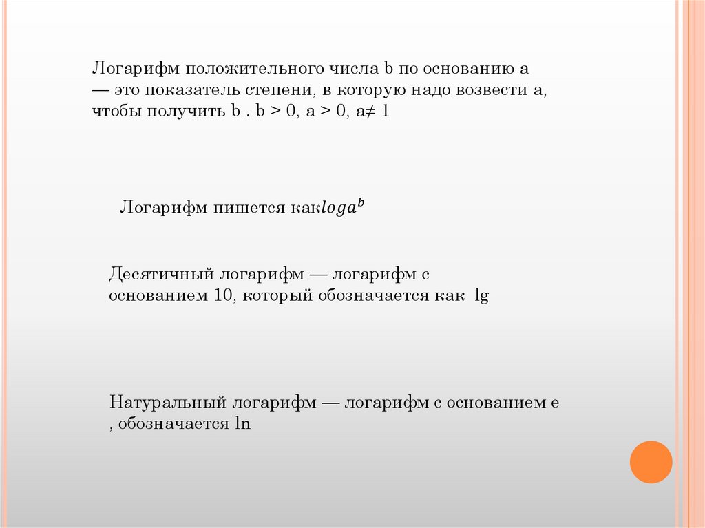 Понятие логарифма. Свойства логарифма. Десятичные и натуральные логарифмы