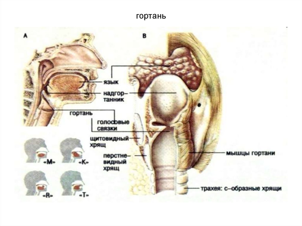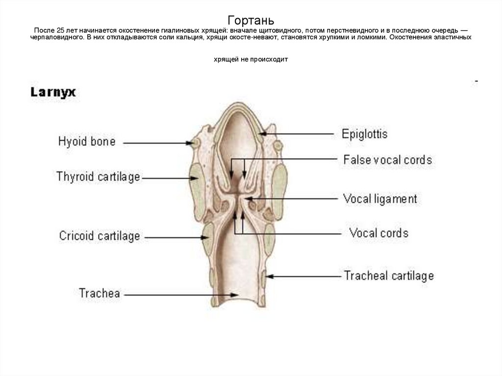 ГортаньПосле 25 лет начинается окостенение гиалиновых хрящей: вначале щитовидного, потом перстневидного и в последнюю очередь —