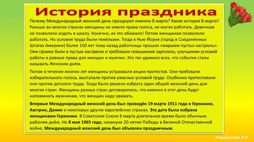 они против детского труда. Тогда было решено избрать один общий женский день для