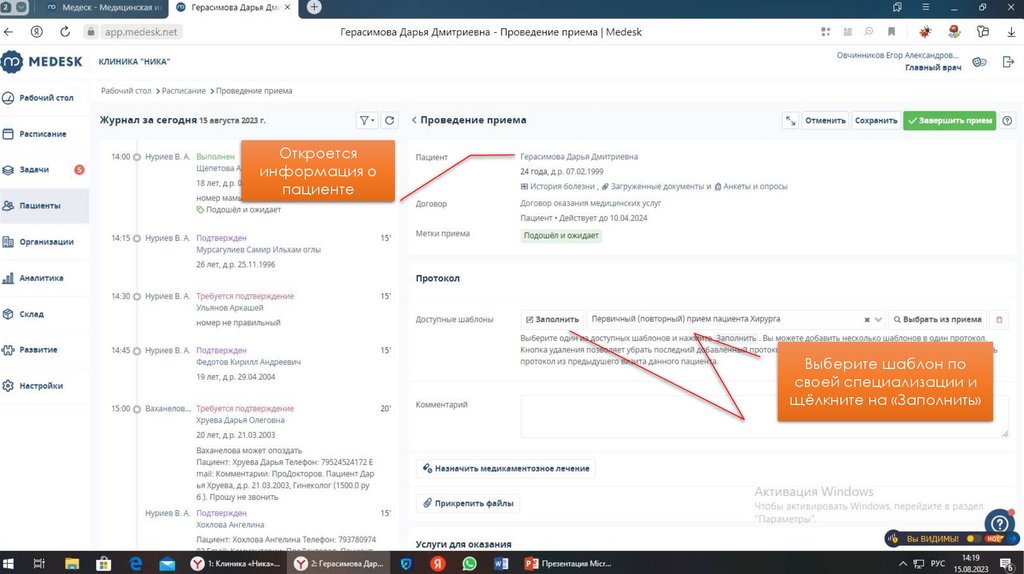 Как только подойдётпациент щёлкните на