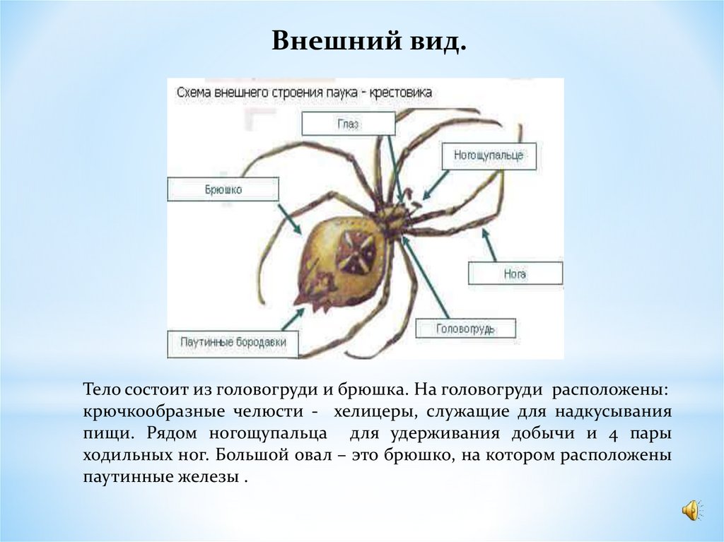 Внешний вид.Тело состоит из головогруди и брюшка. На головогруди расположены: