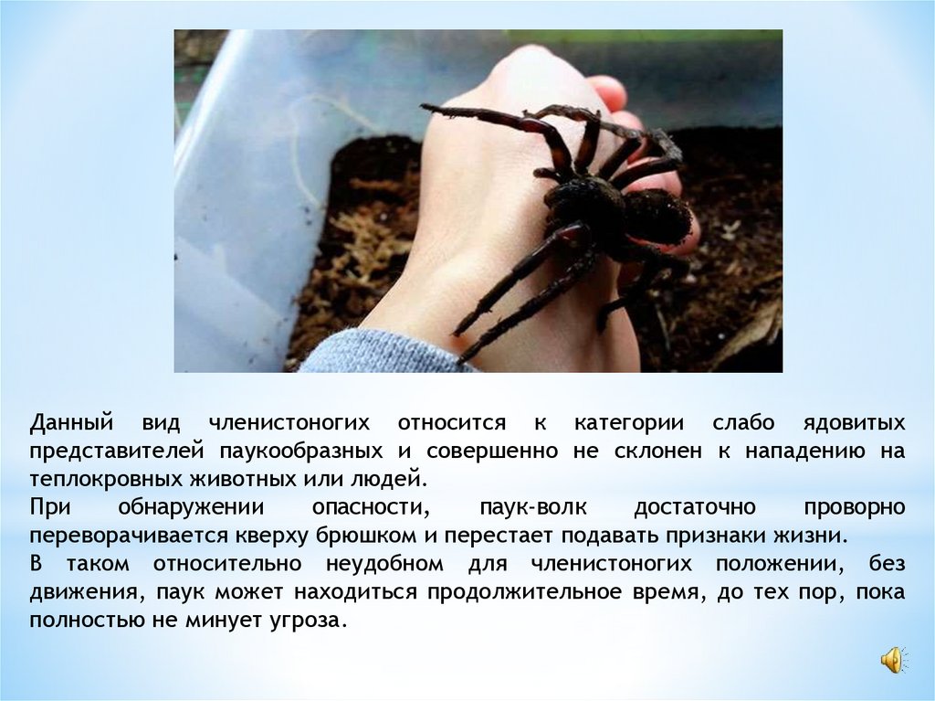 Данный вид членистоногих относится к категории слабо ядовитыхпредставителей паукообразных и совершенно не склонен к нападению на