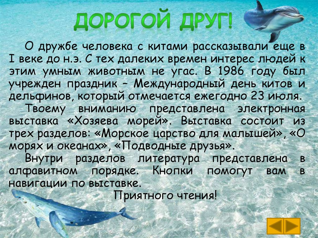 Электронная выставка, посвященная Международному дню китов и дельфинов "Хозяева морей"