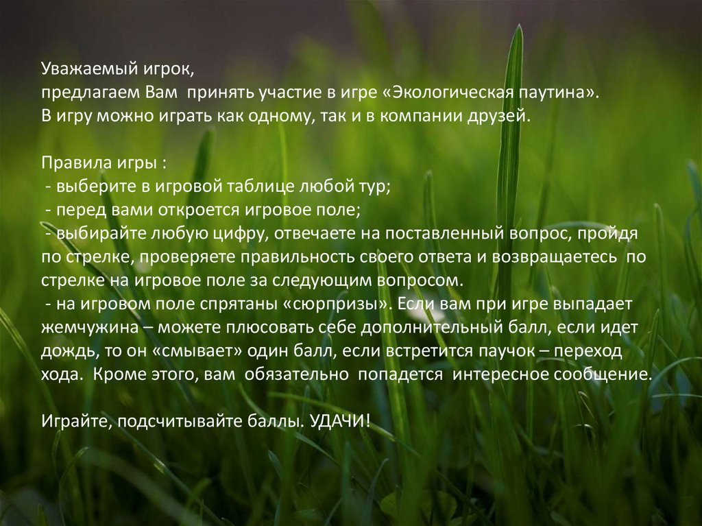 Уважаемый игрок,предлагаем Вам принять участие в игре «Экологическая паутина».