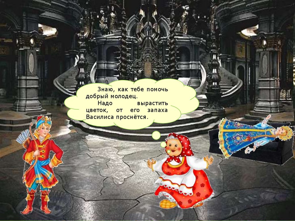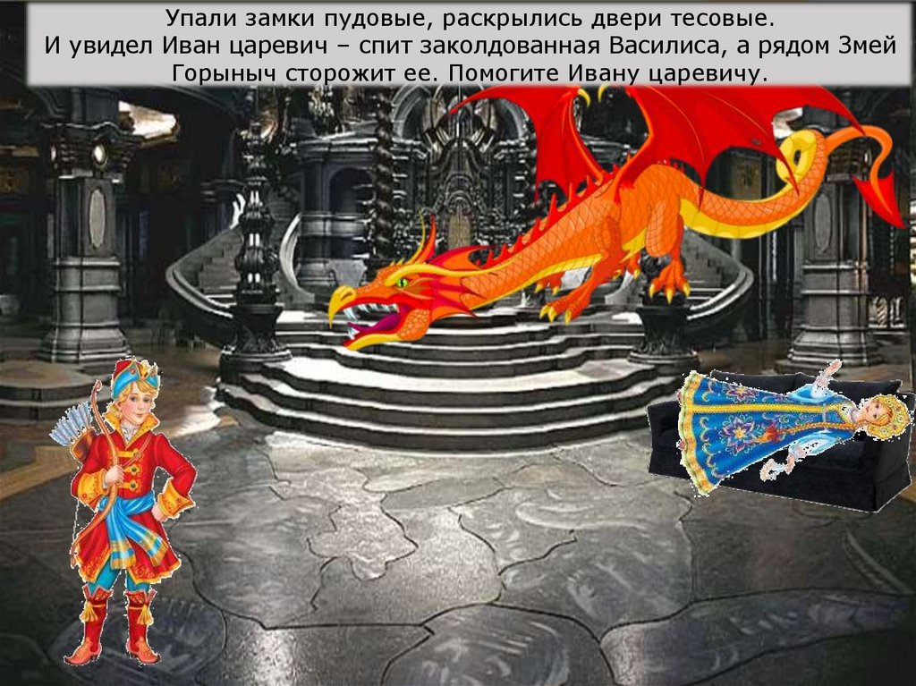 Упали замки пудовые, раскрылись двери тесовые.И увидел Иван царевич – спит заколдованная Василиса, а рядом Змей