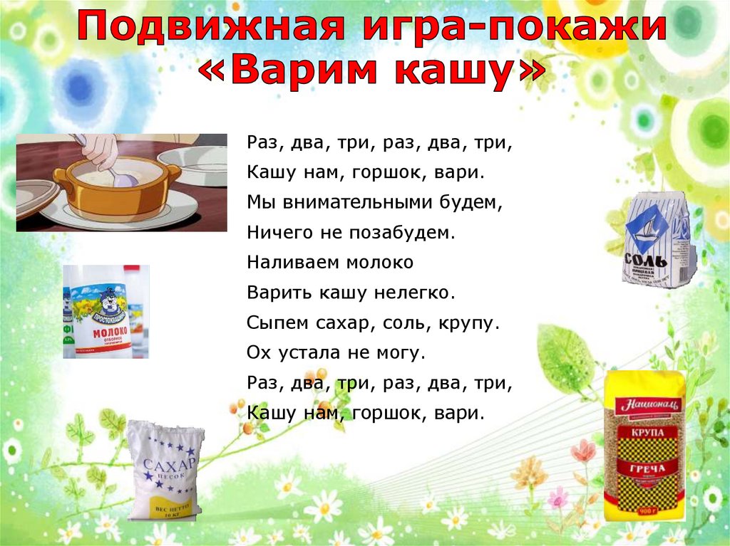 Раз, два, три, раз, два, три,Кашу нам, горшок, вари.