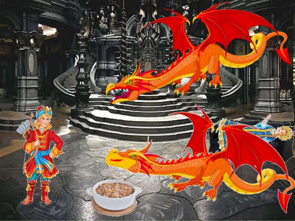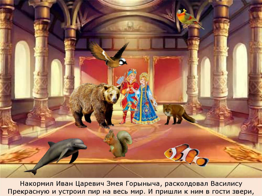 Накормил Иван Царевич Змея Горыныча, расколдовал ВасилисуПрекрасную и устроил пир на весь мир. И пришли к ним в гости звери,