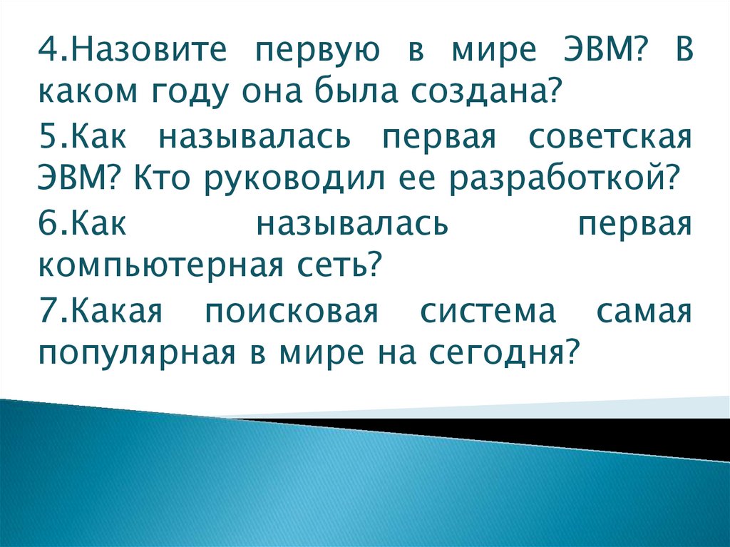 4.Назовите первую в мире ЭВМ? Вкаком году она была создана?