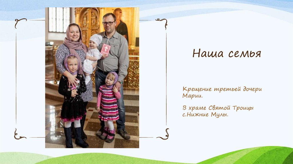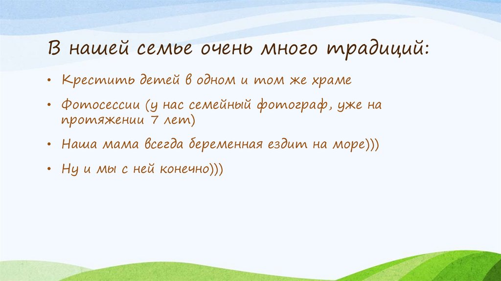 В нашей семье очень много традиций:• Крестить детей в одном и том же храме