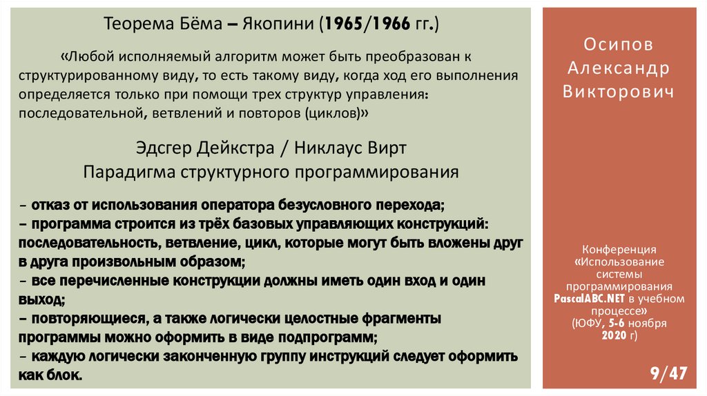 Теорема Бёма – Якопини (1965/1966 гг.)«Любой исполняемый алгоритм может быть преобразован к