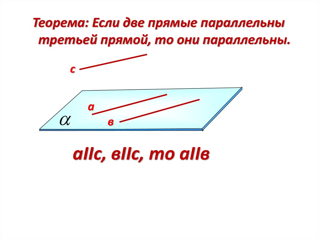 Теорема: Если две прямые параллельнытретьей прямой, то они параллельны.