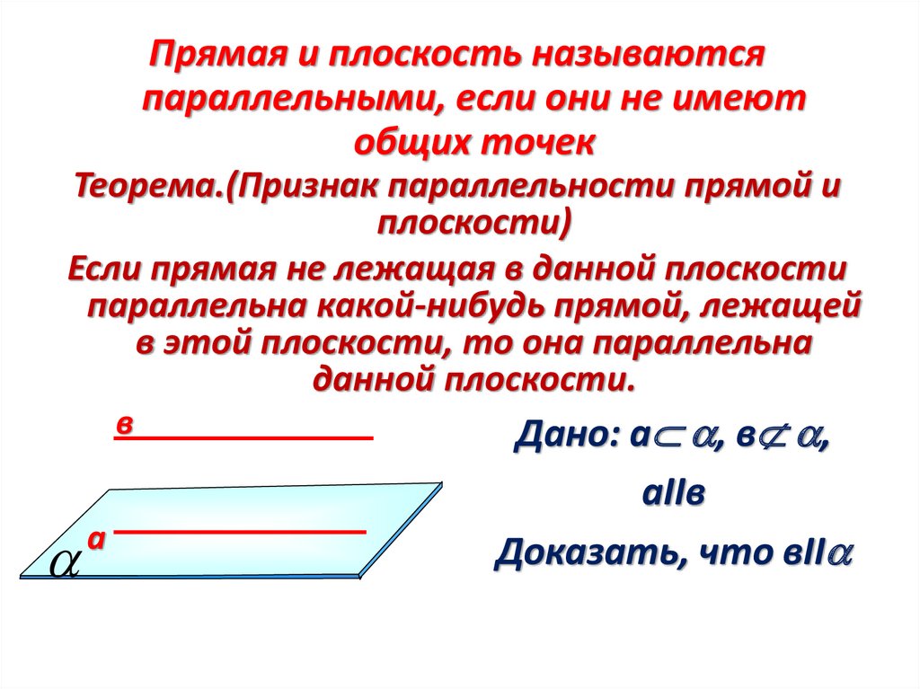 Прямая и плоскость называютсяпараллельными, если они не имеют