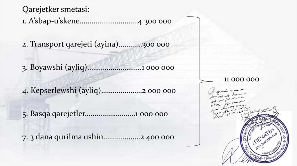 Qarejetker smetasi:1. A’sbap-u’skene…………………………4 300 000