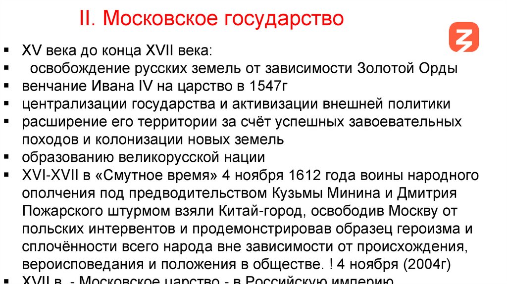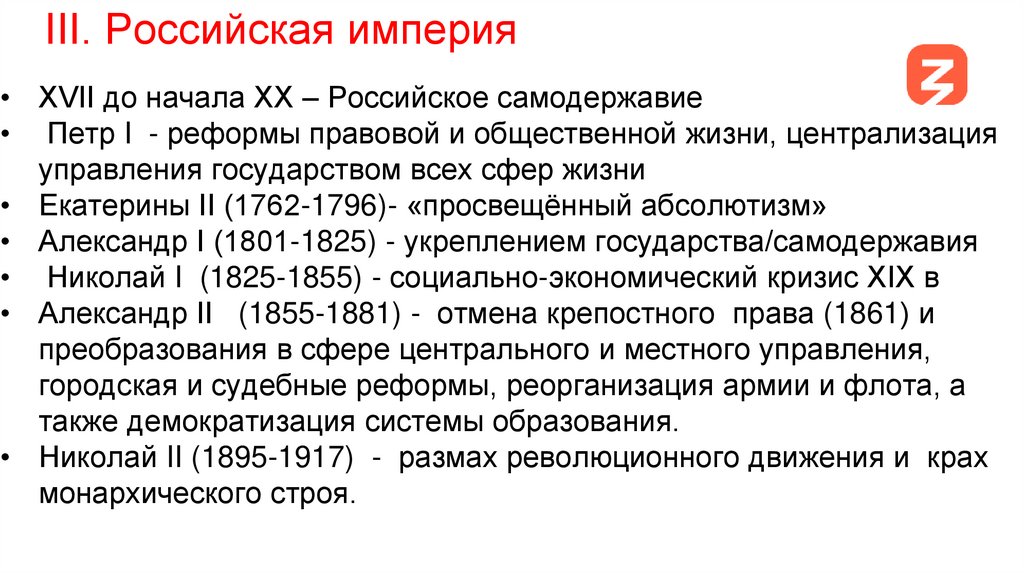 III. Российская империя• ХVII до начала ХХ – Российское самодержавие