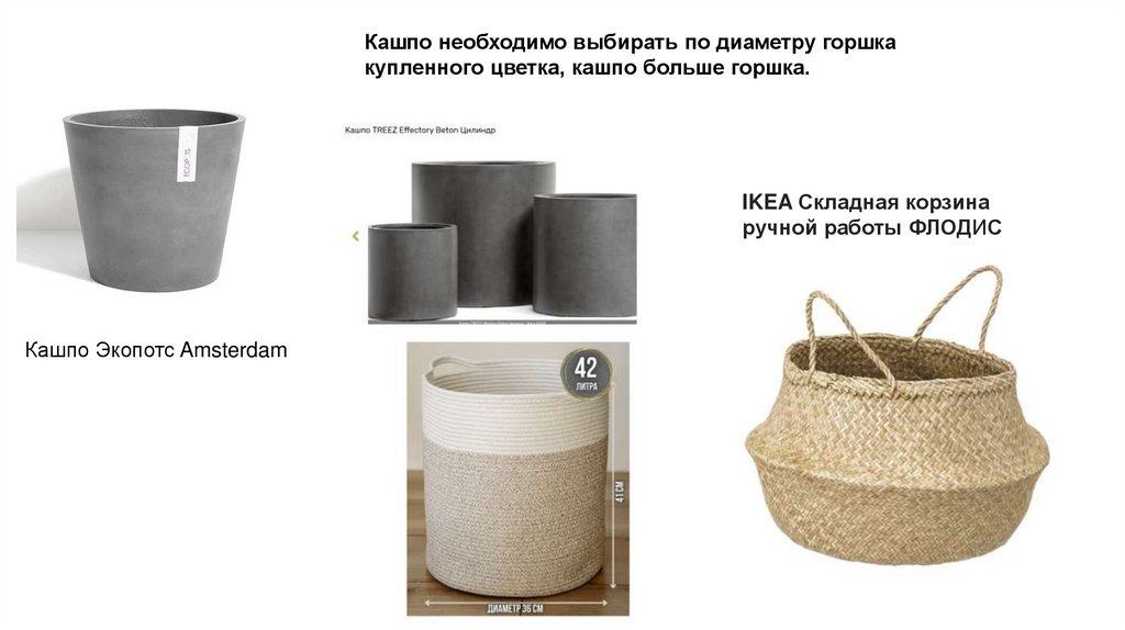 Кашпо необходимо выбирать по диаметру горшкакупленного цветка, кашпо больше горшка.