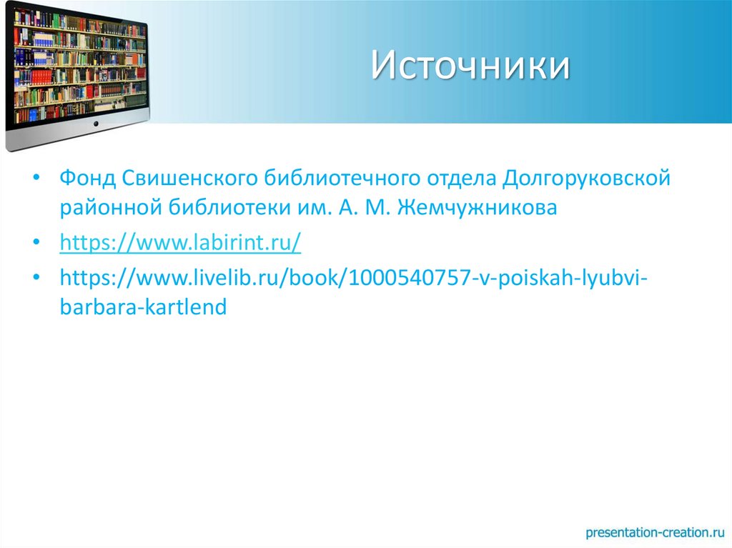 Источники• Фонд Свишенского библиотечного отдела Долгоруковской