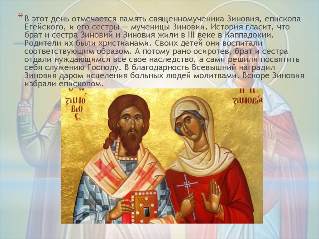 * В этот день отмечается память священномученика Зиновия, епископаЕгейского, и его сестры — мученицы Зиновии. История гласит, что