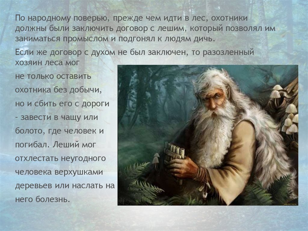По народному поверью, прежде чем идти в лес, охотникидолжны были заключить договор с лешим, который позволял им