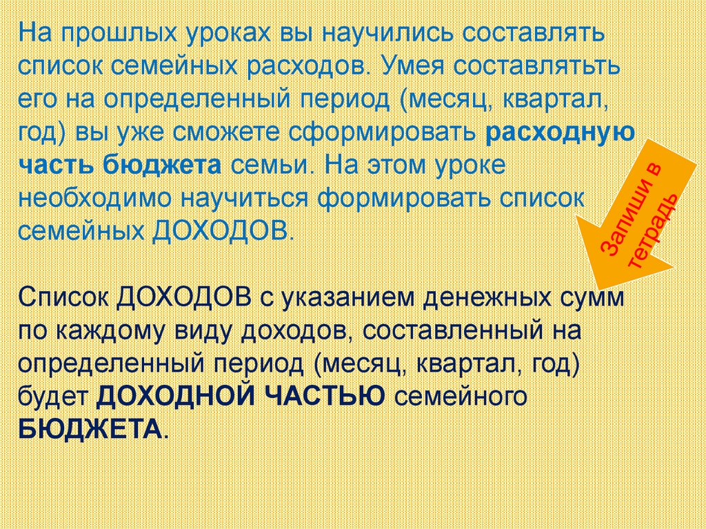 На прошлых уроках вы научились составлятьсписок семейных расходов. Умея составлятьть