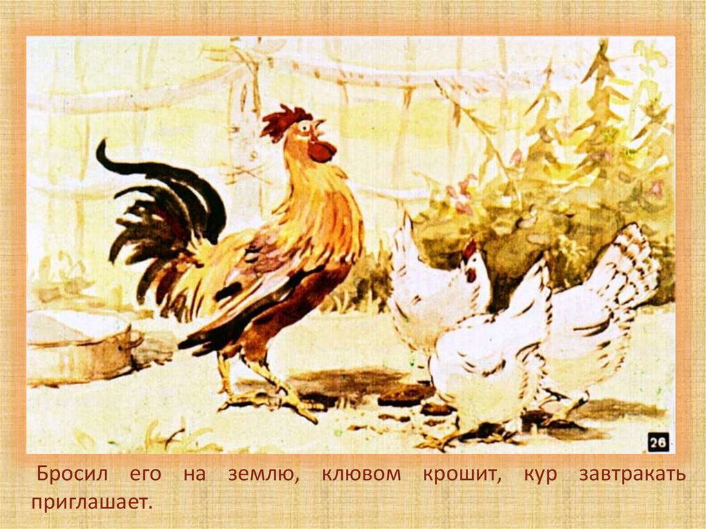 Бросил его на землю, клювом крошит, кур завтракатьприглашает.