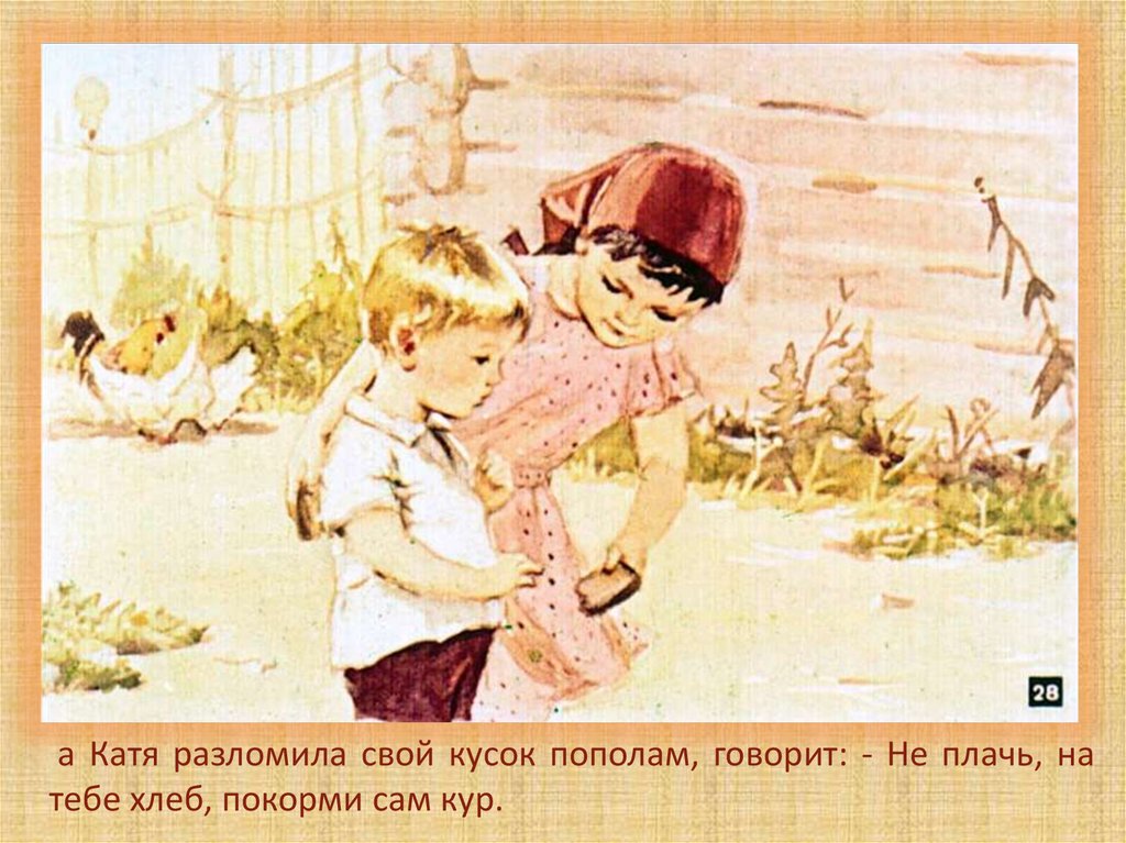 а Катя разломила свой кусок пополам, говорит: - Не плачь, натебе хлеб, покорми сам кур.