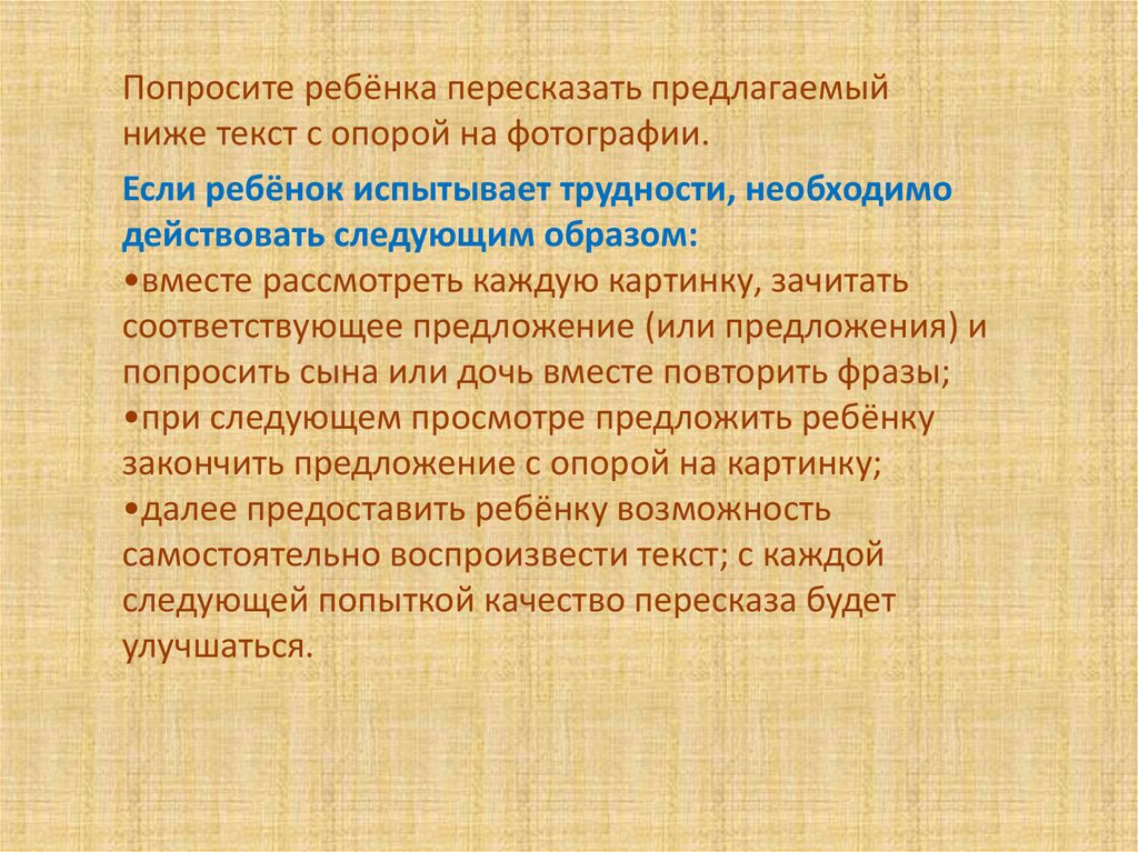 Попросите ребёнка пересказать предлагаемыйниже текст с опорой на фотографии.