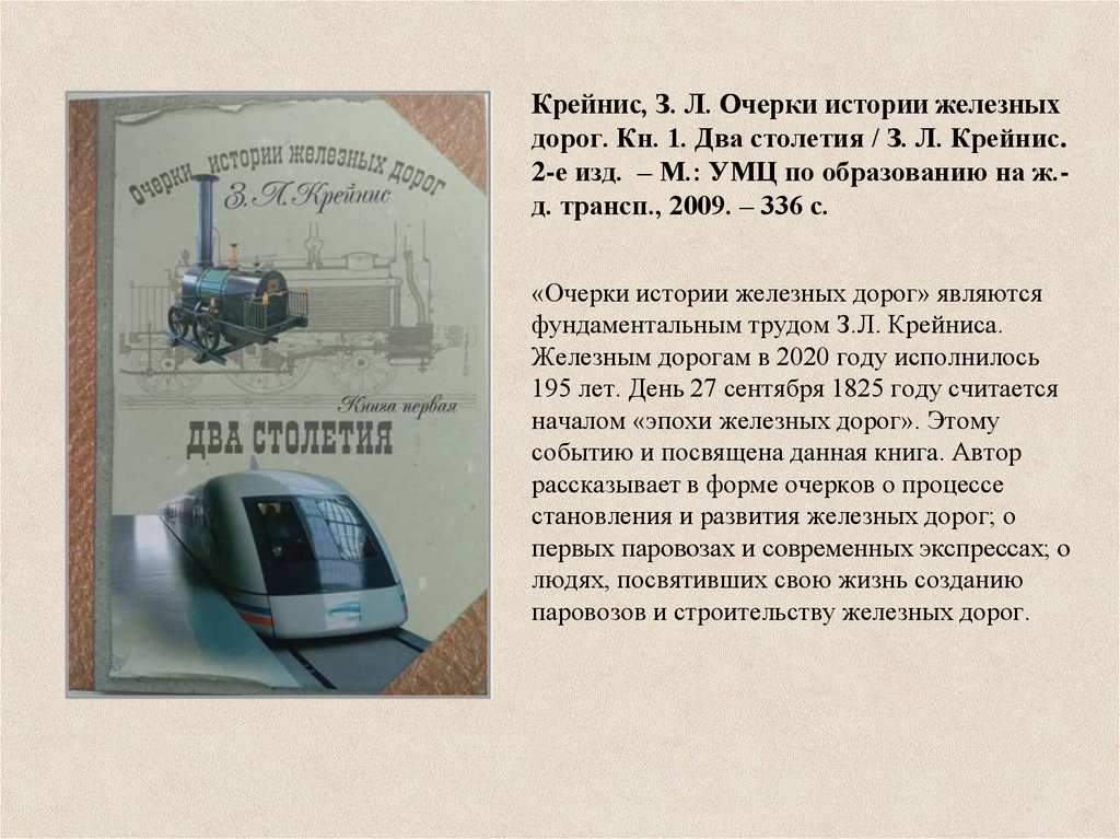 Крейнис, З. Л. Очерки истории железныхдорог. Кн. 1. Два столетия / З. Л. Крейнис.