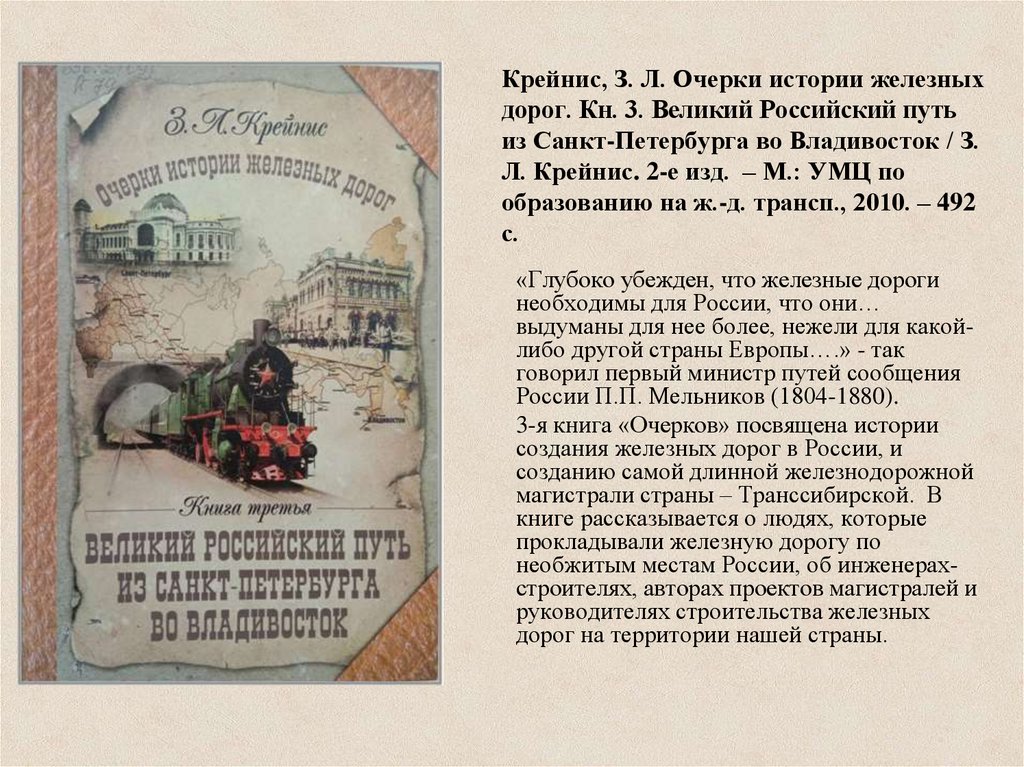 Крейнис, З. Л. Очерки истории железныхдорог. Кн. 3. Великий Российский путь