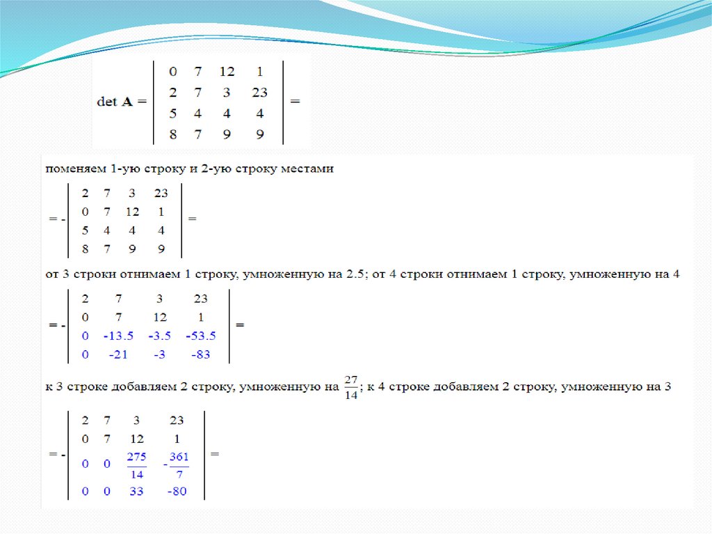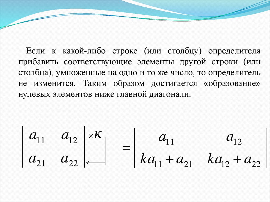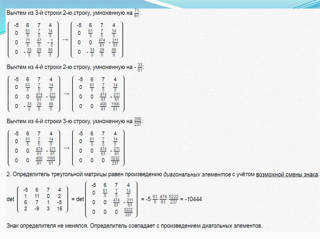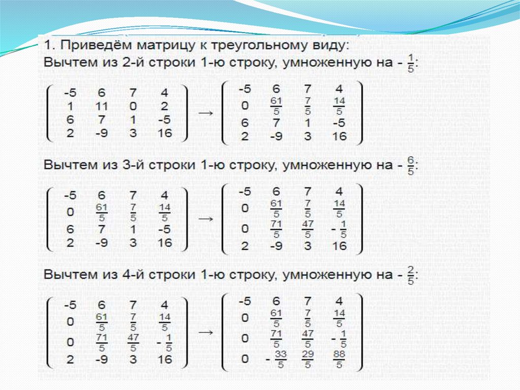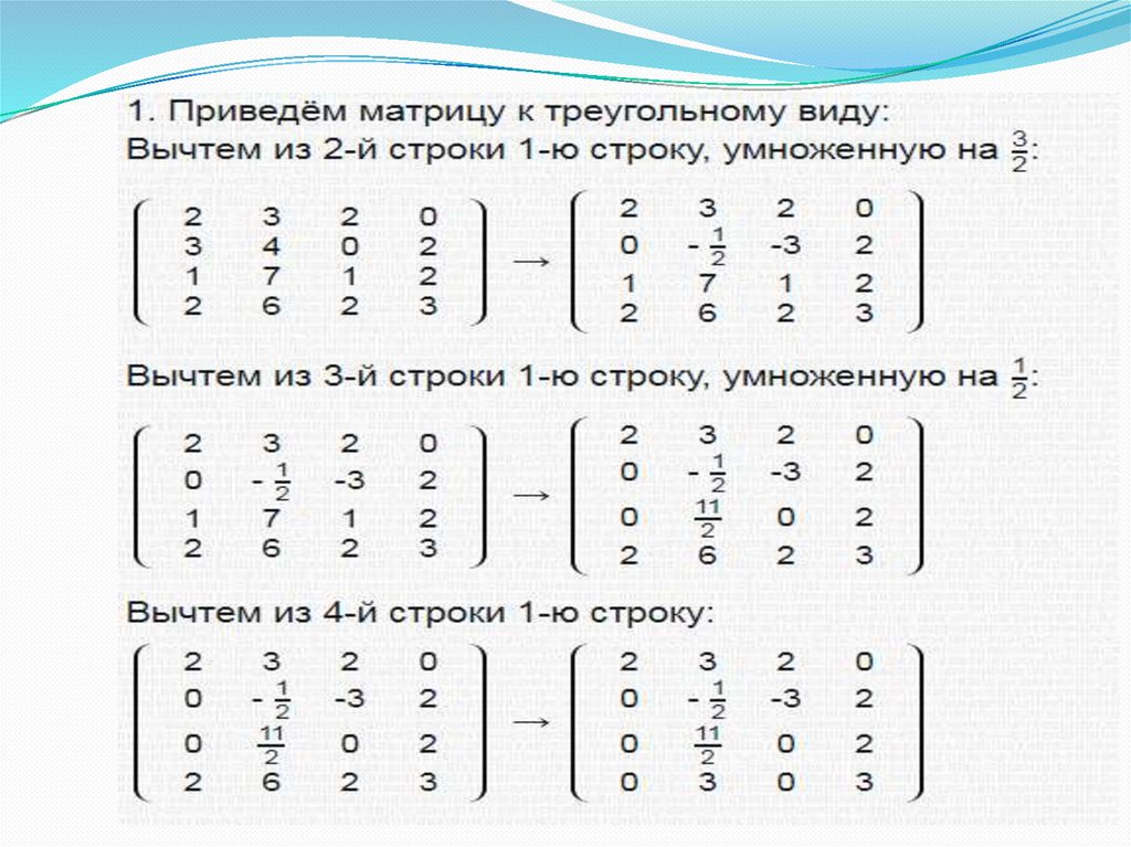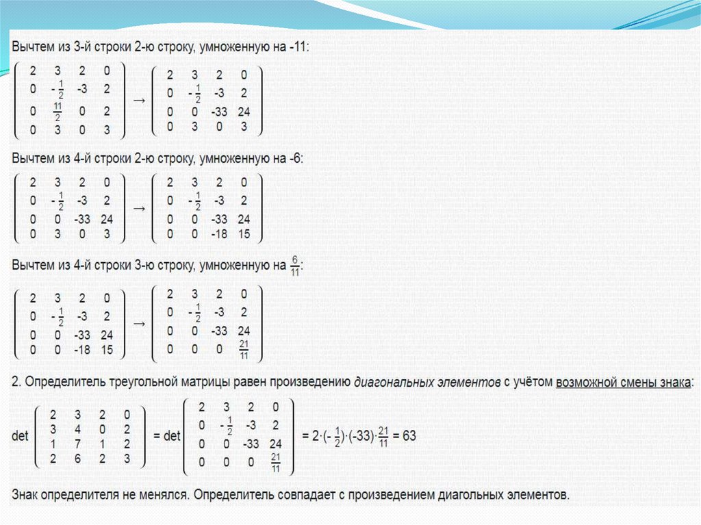 Для представления матрицы в треугольном виденеобходимо помнить следующие свойства: