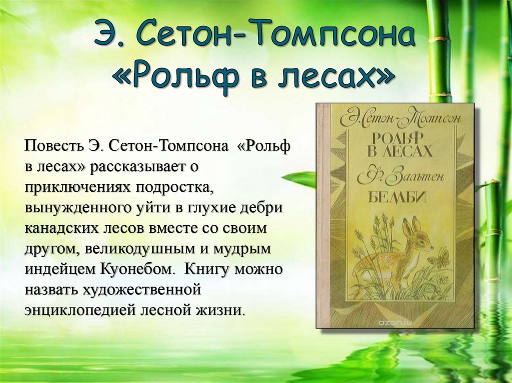 Повесть Э. Сетон-Томпсона «Рольфв лесах» рассказывает о