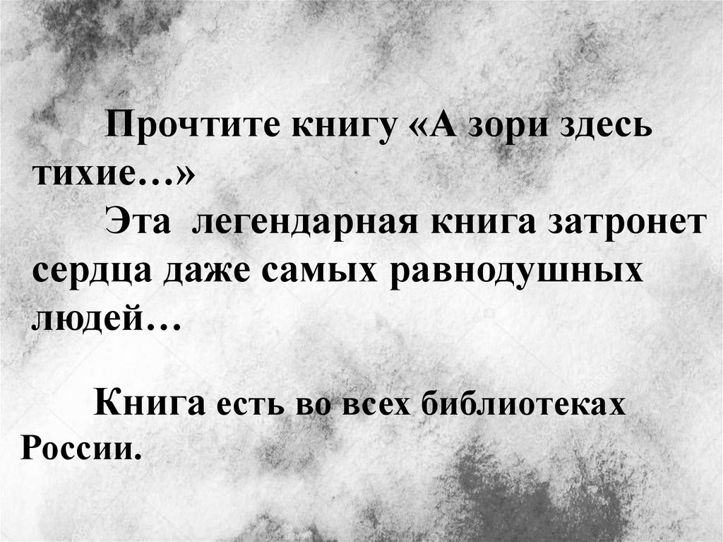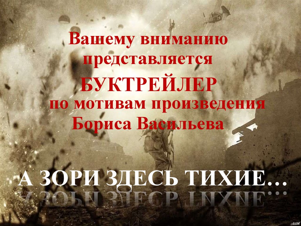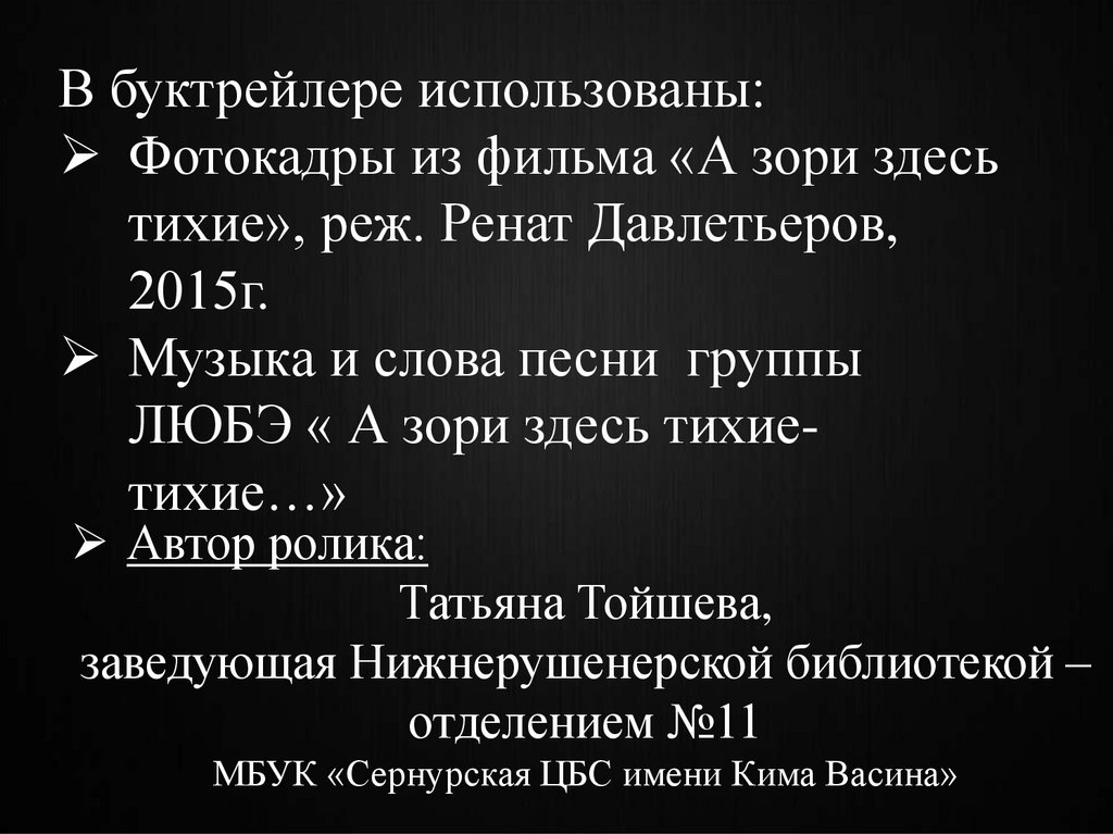 В буктрейлере использованы:Фотокадры из фильма «А зори здесь