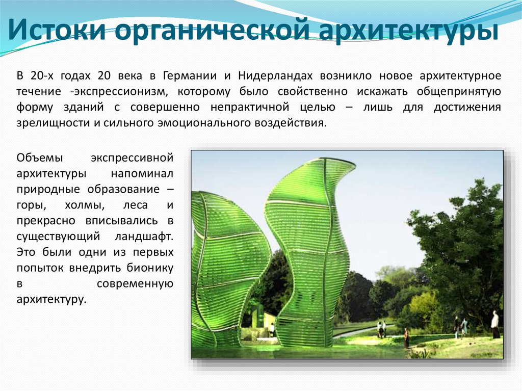 Истоки органической архитектурыВ 20-х годах 20 века в Германии и Нидерландах возникло новое архитектурное