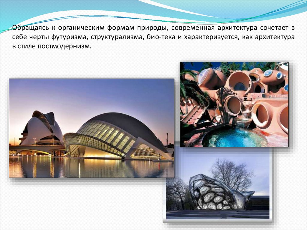 Обращаясь к органическим формам природы, современная архитектура сочетает всебе черты футуризма, структурализма, био-тека и характеризуется, как архитектура
