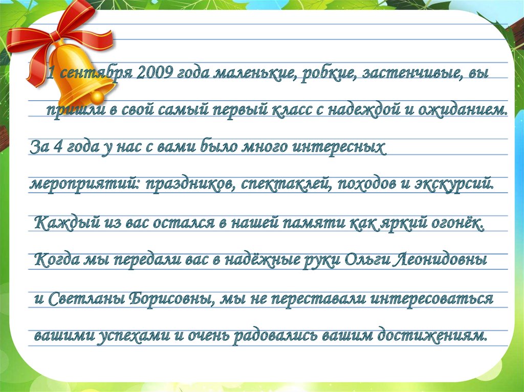 1 сентября 2009 года маленькие, робкие, застенчивые, выпришли в свой самый первый класс с надеждой и ожиданием.