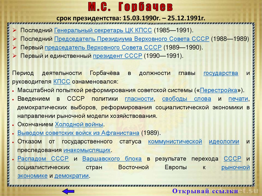 срок президентства: 15.03.1990г. – 25.12.1991г.Последний Генеральный секретарь ЦК КПСС (1985—1991).