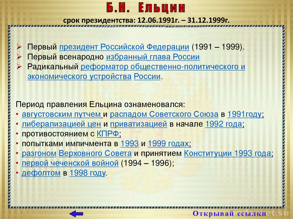 срок президентства: 12.06.1991г. – 31.12.1999г.Первый президент Российской Федерации (1991 – 1999).